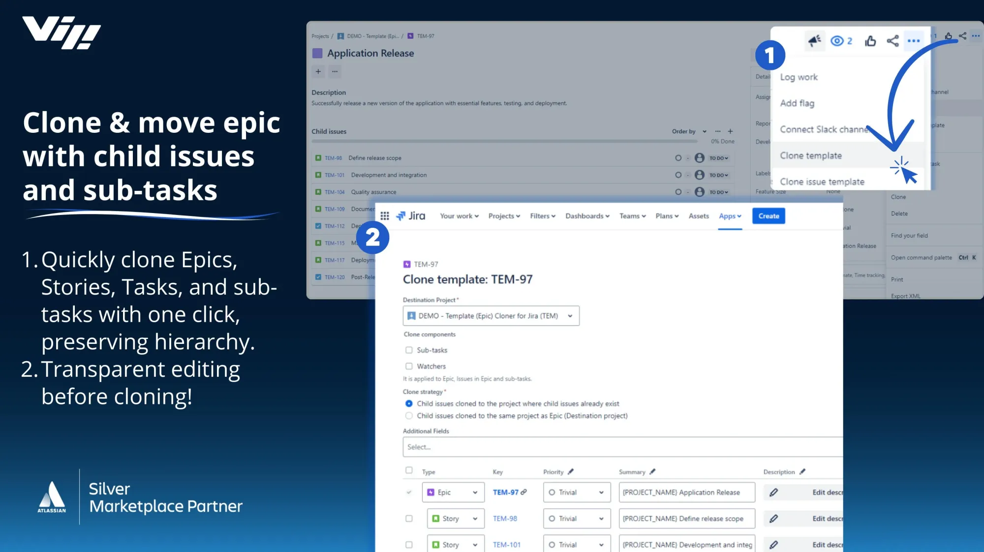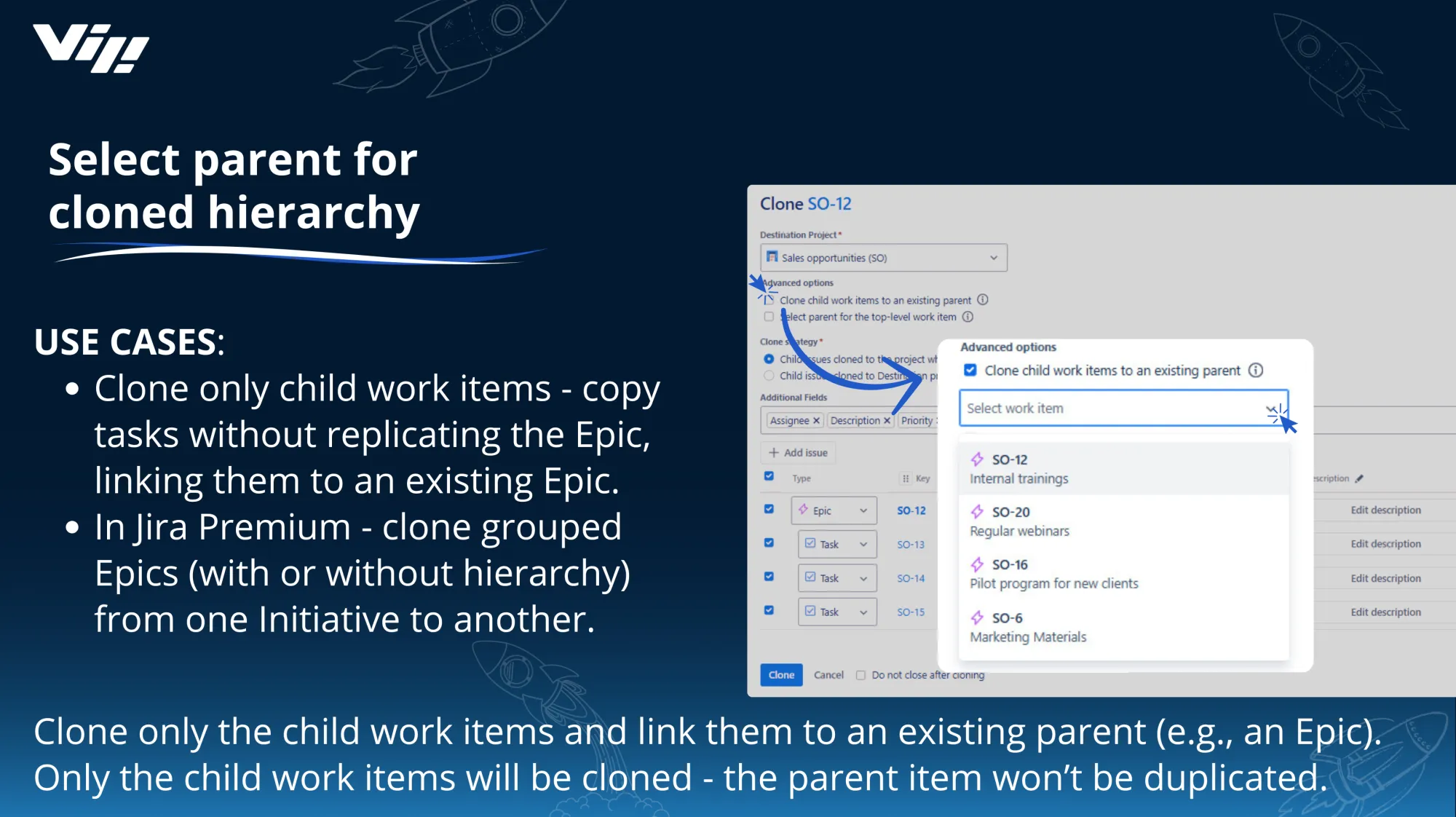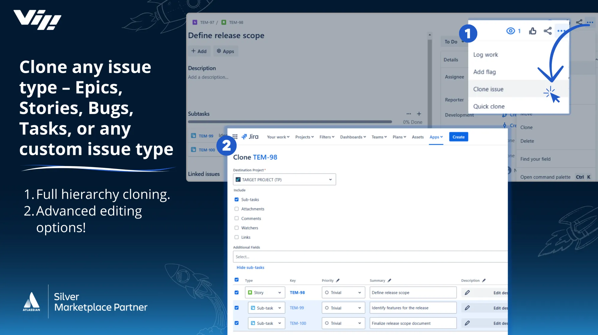 - Documentation: https://jira-apps.vilisoft.com/clone-expert-for-jira-documentation/getting-started/