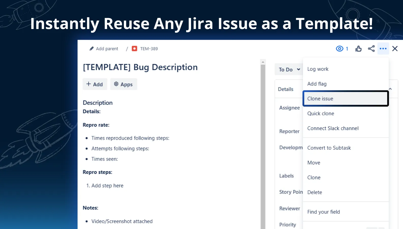 - Direct link: https://marketplace.atlassian.com/apps/1217678/clone-expert-for-jira-templates-epics-and-issues