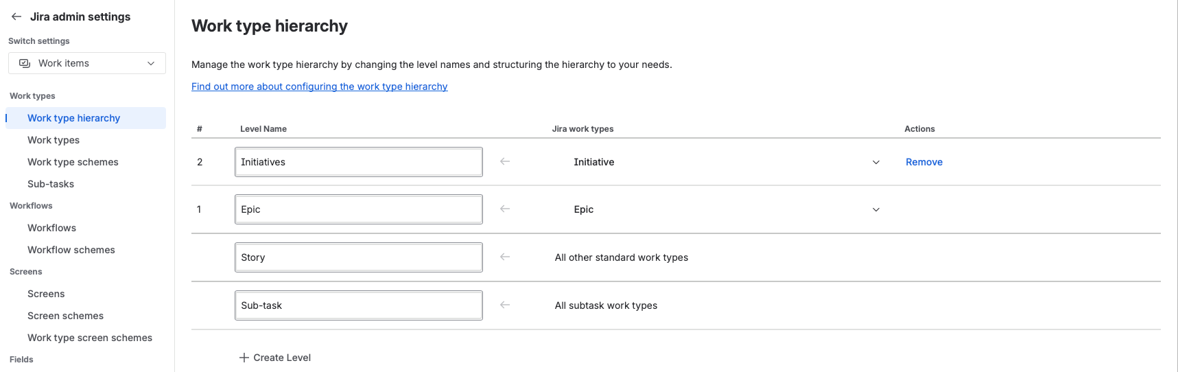 - Name the level Initiative and map your new "Initiative" Work Item type to this level