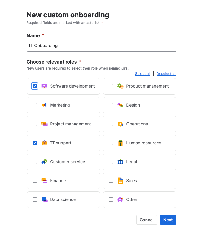 When you create a new onboarding flow, you'll choose which roles it applies to. Atlassian gives you around 20 pre-built roles to choose from: